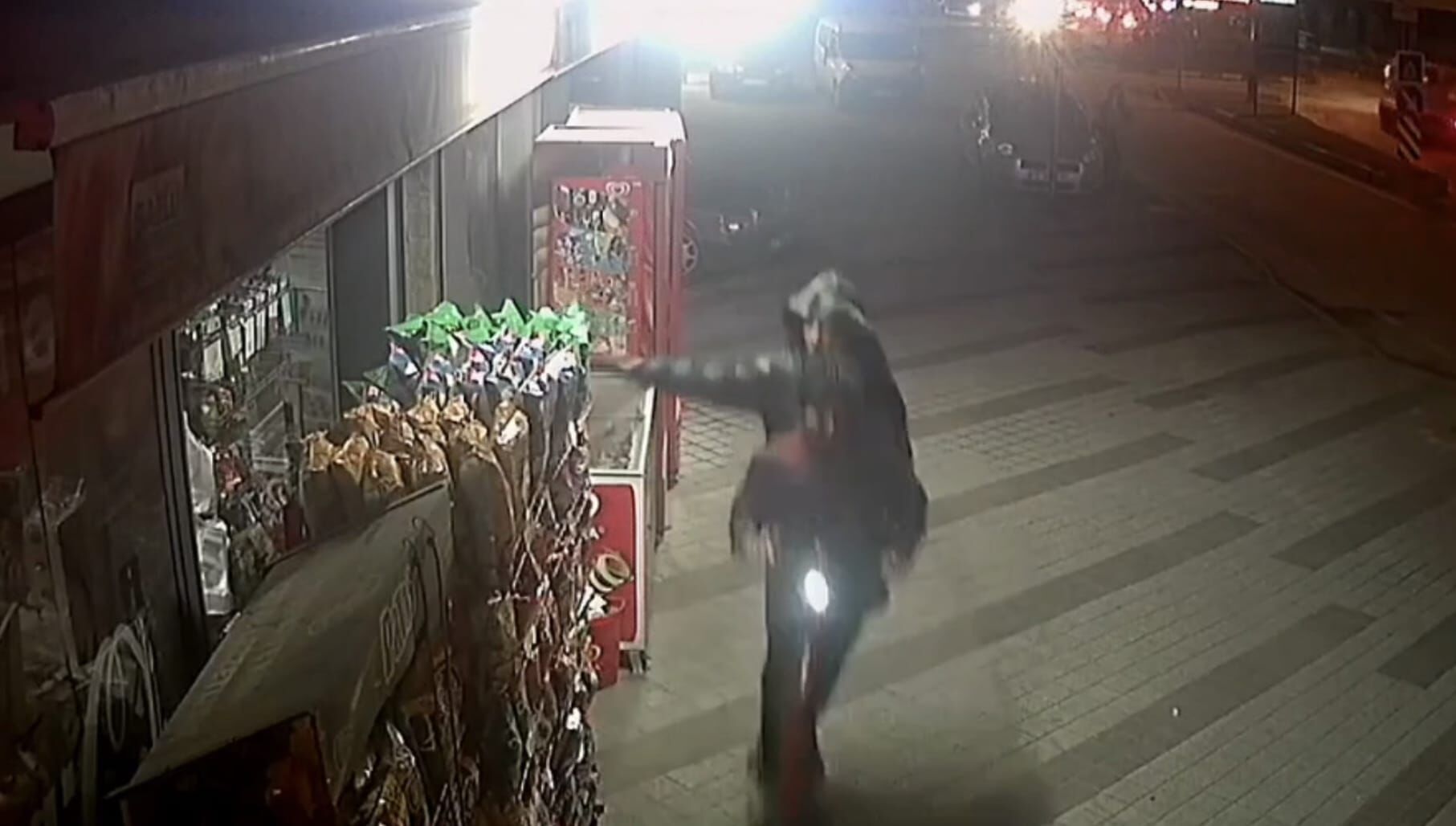 İnegöl'de scoterli gençlerin market önündeki raftan cips çalma anı kameraya yansıdı.