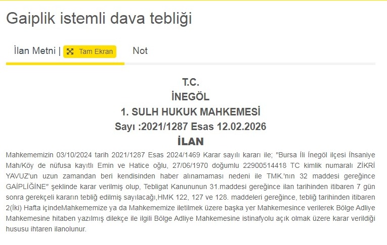 Bursa'nın İnegöl ilçesinde 1970 doğumlu Zikri Yavuz’un uzun süredir kayıp olması ve kendisinden herhangi bir iz bulunamaması üzerine açılan davada karar açıklandı. İnegöl 1. Sulh Hukuk Mahkemesi’nde görülen davada, Türk Medeni Kanunu’nun 32. maddesi (gaiplik) kapsamında Zikri Yavuz’un resmen gaip ilan edilmesine hükmedildi.