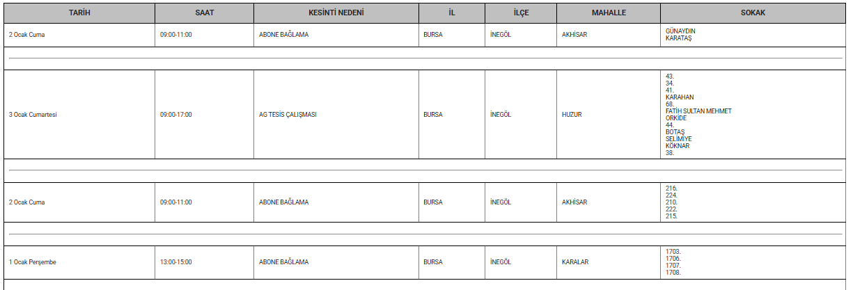 UEDAŞ tarafından yapılan açıklamada, 1, 2 ve 3 Ocak tarihlerinde yapılacak abone bağlama, ag tesis çalışması, ag hat ilavesi çalışmaları nedeniyle İnegöl’ün 4 mahallesinde geçici elektrik kesintileri yaşanacağı belirtildi. Bu kapsamda Akhisar, Huzur, Karalar ve Turgutalp mahallelerine belirli saatlerde enerji verilemeyeceği ifade edildi.