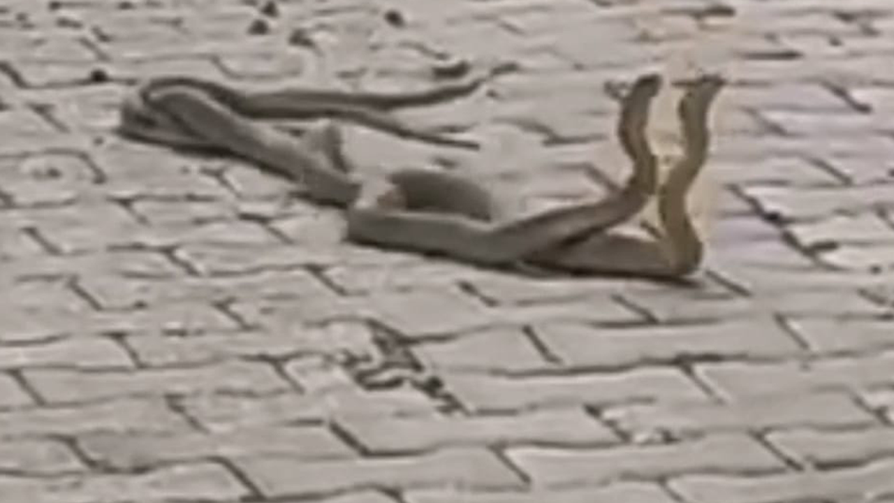 Sokakta karşı karşıya gelen iki yılanın birbirleriyle adeta dans eder gibi hareket ettiği anlar, çevredeki bir vatandaşın cep telefonu kamerasına yansıdı.