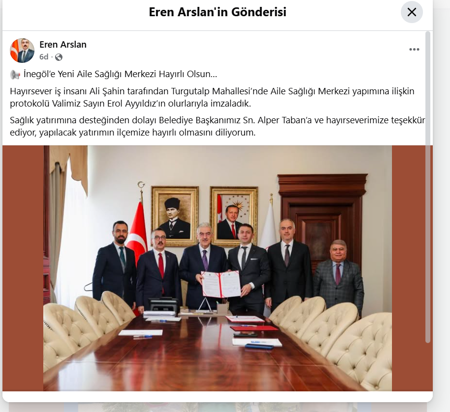 Hayırsever iş insanı Ali Şahin tarafından Turgutalp Mahallesi’nde inşa edilecek Aile Sağlığı Merkezi’ne ilişkin protokolün, Erol Ayyıldız’ın onayıyla imzalandığı bildirildi.