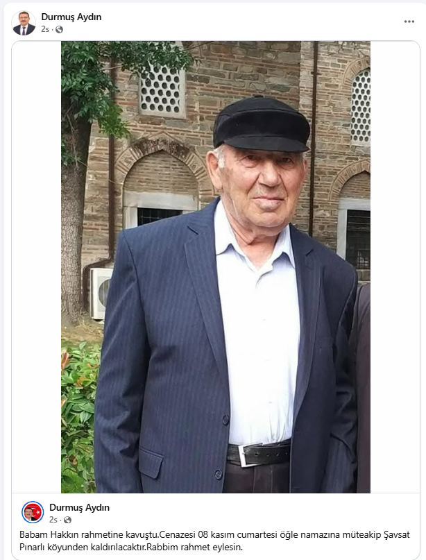 Durmuş Aydın, sosyal medya hesabından yaptığı paylaşımda, "Babam Hakkın rahmetine kavuştu. Cenazesi 08 kasım cumartesi öğle namazına müteakip Şavsat Pınarlı köyünden kaldırılacaktır. Rabbim rahmet eylesin." ifadelerini kullandı.