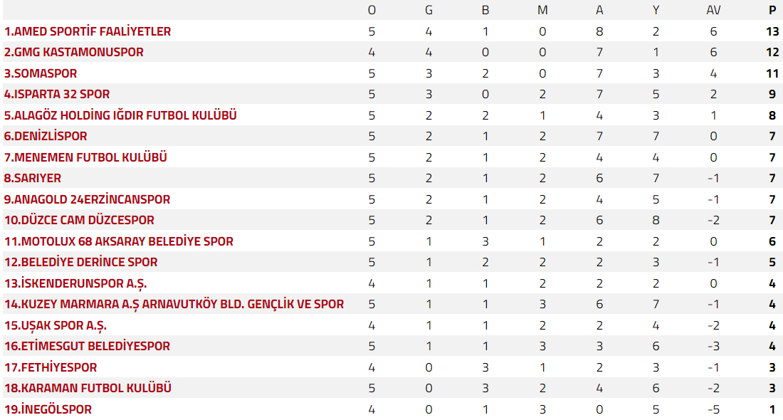 Geride kalan 5 hafta sonunda grupta lider Amedspor ve 2. Sırada yer alan Kastamonuspor’la birlikte yenilgi yüzü görmeyen 3 takımdan biri olan Somaspor, 5 maçta aldığı 3 galibiyet ve 2 beraberlikte 11 puanla 3. Sırada bulunuyor.