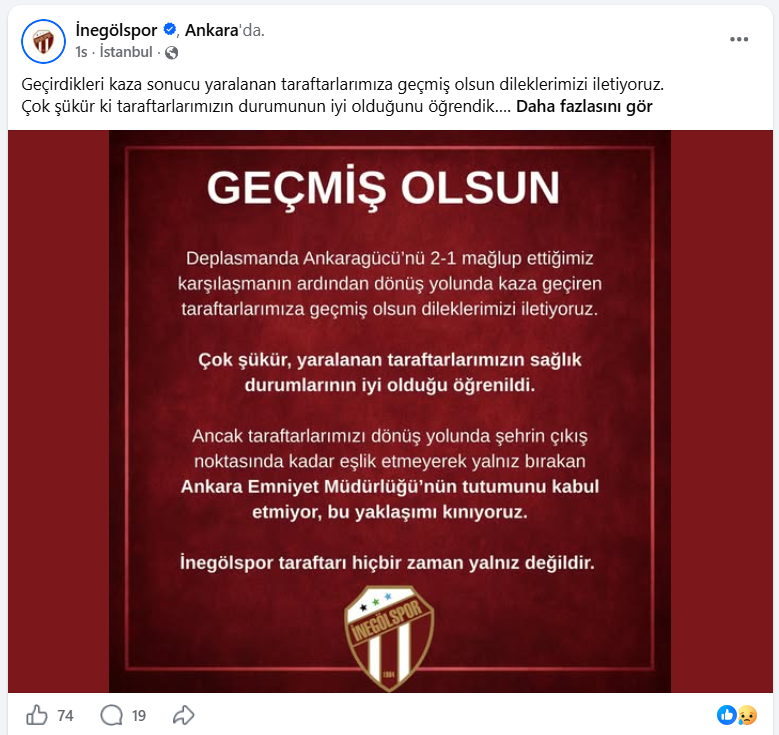Kulüp, kazada yaralanan taraftarlara geçmiş olsun dileklerini iletirken, sağlık durumlarının iyi olduğunu bildirdi. Ankara Emniyet Müdürlüğü’ne yönelik eleştirilerin de yer aldığı açıklamada şu ifadelere yer verildi: “Taraftarlarımızı dönüş yolunda şehrin çıkış noktasına kadar eşlik etmeyerek yalnız bırakan Ankara Emniyet Müdürlüğü’nün tutumunu kabul etmiyor, bu yaklaşımı kınıyoruz. İnegölspor taraftarı hiçbir zaman yalnız değildir.”