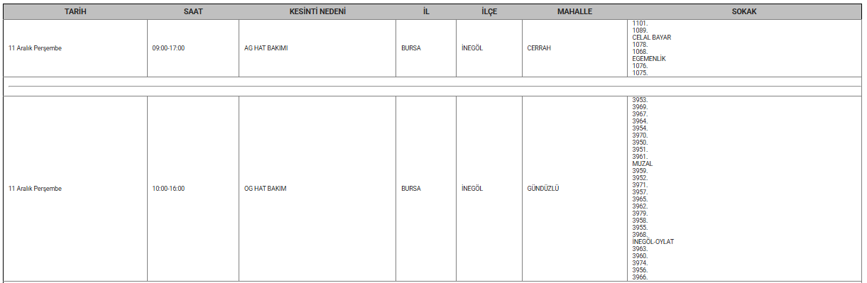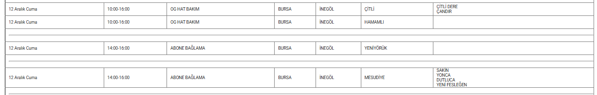UEDAŞ tarafından paylaşılan bilgilere göre, 11-12 Aralık tarihlerinde gerçekleştirilecek hat bakım çalışmaları, tesis yenilemeleri ve abone bağlantı işlemleri nedeniyle ilçe genelinde belirli noktalarda enerji kesintisi yaşanacak. Plan kapsamındaki çalışmalardan Cerrah, Gündüzlü, Akıncılar, Çitli, Hamamlı, Yeniyörük ve Mesudiye mahalleleri etkilenecek.