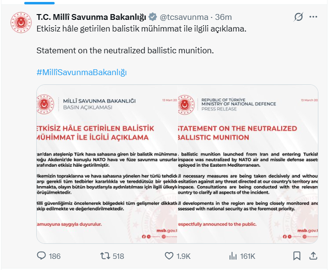 "İran’dan ateşlenip Türk hava sahasına giren bir balistik mühimmat Doğu Akdeniz’de konuşlu NATO hava ve füze savunma unsurları tarafından etkisiz hâle getirilmiştir. Ülkemizin topraklarına ve hava sahasına yönelen her türlü tehdide karşı gerekli tüm tedbirler kararlılıkla ve tereddütsüz bir şekilde alınmakta, olayın bütün boyutlarıyla aydınlatılması için ilgili ülkeyle görüşülmektedir. Milli güvenliğimiz öncelenerek bölgedeki tüm gelişmeler dikkatle takip edilmekte ve değerlendirilmektedir. Kamuoyuna saygıyla duyurulur."
