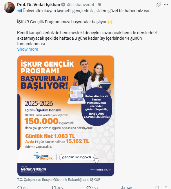 Bakan Işıkhan, detaylı bilgilere ve başvuru koşullarına https://genclik.iskur.gov.tr/ adresinden ve üniversitelerin ilgili birimlerinden ulaşılabileceğini belirtti.