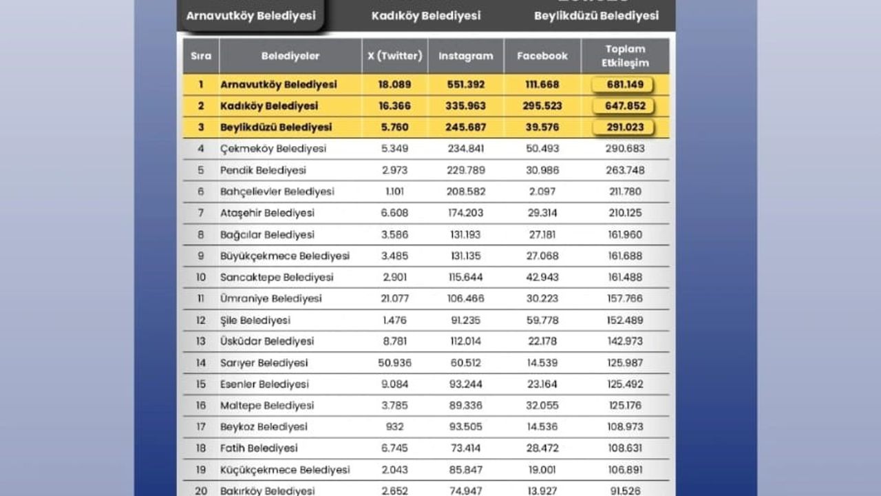 İstanbul'daki ilçe belediyelerinin sosyal medya performansları karşılaştırıldı. Açıklanan verilere göre, 2025 yılı sosyal medya etkileşim rakamlarında Arnavutköy Belediyesi ilk sırada yer aldı. X, Instagram ve Facebook platformları üzerinden elde edilen toplam etkileşimlerin değerlendirildiği karşılaştırmada Arnavutköy Belediyesi, 681 bin 149 etkileşimle listenin zirvesine yerleşti. Arnavutköy'ü Kadıköy Belediyesi 647 bin 852 etkileşimle ikinci sıradan takip ederken, Beylikdüzü Belediyesi 291 bin 23 etkileşimle üçüncü sırada yer aldı.