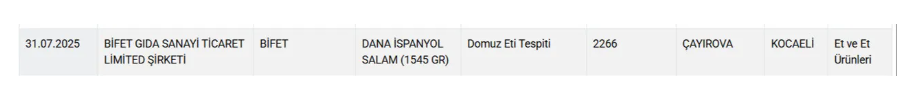 Sektörde 60 yıldır faaliyet gösteren Bifet Gıda'ya ait "Bifet" marka dana sucukta "domuz eti" tespit edildi. Aynı markanın salamından da domuz eti çıkmıştı.