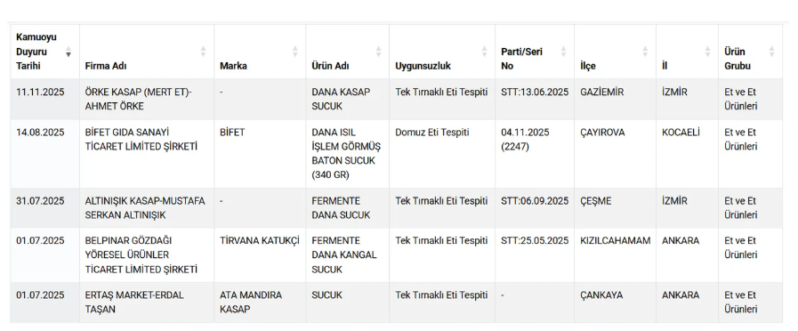Listeye göre, domuz, at ve eşek etinden sucuk yapılması mide bulandırdı. "guvenilirgida.tarimorman.gov.tr" adresinden yayınlanan listede ünlü bir marka da yer aldı.