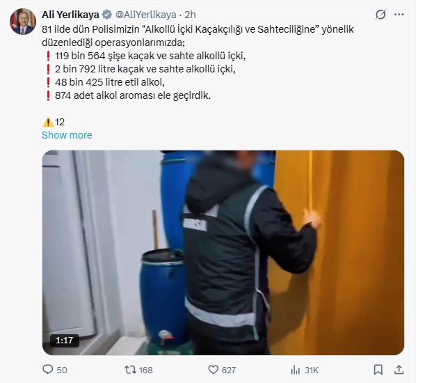 Son 1 ayda 81 ilde gerçekleştirilen operasyonlarda: 151 bin 800 şişe kaçak ve sahte alkollü içki, 91 bin 100 litre etil alkol, 10 bin 448 litre kaçak ve sahte alkollü içki ele geçirildi. Ekipler ayrıca 29 yasa dışı imalathaneyi tespit ederek kapatırken 528 şüpheli hakkında da adli işlem uyguladı. Yerlikaya, paylaşımında sahte alkol üretimine yönelik operasyonların aralıksız sürdüğünü belirterek vatandaşlara "Lütfen şüpheli durumları 112 Acil Çağrı Merkezimize bildirin. “Biz Gereğini Yaparız” çağrısında bulundu.