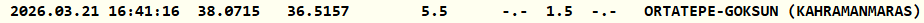 Saat 16.41'de Kahramanmaraş'ın Göksun ilçesinde deprem meydana geldi. Kandilli Rasathanesi Göksun merkezli depremin 1.5 büyüklüğünde gerçekleştiğini belirtti. Depremin derinliği 5.5 kilometre ölçüldü.