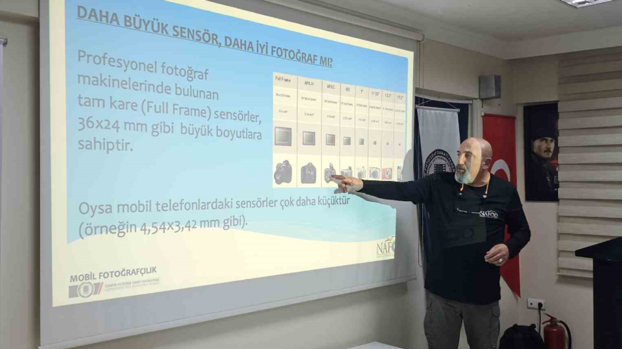 NAFOD ve Aydın Fotoğraf Sanatı Derneği (AYFOD) işbirliğinde Nazilli’deki dernek hizmet binasında düzenlenen etkinliğe çok sayıda fotoğraf tutkunu katıldı. NAFOD Yönetim Kurulu Üyesi, Fotoğraf Eğitmeni Kamil Okyay, eğitim seminerine katılan üyeler başta olmak üzere öğrenci ve diğer fotoğraf meraklılarına mobil fotoğrafçılığın temellerini anlattı. Mobil fotoğrafçılığın temelleri, renk uyumu ve kontrast, mobil fotoğrafçılıkta bakış ve hareket yönü, mobil fotoğrafçılıkta çizgiler - çerçeveler, mobil fotoğrafçılıkta kompozisyon, uygulama önerileri, ekipman ve aksesuarlar ile mobil fotoğraf uygulamalarını anlattı. 30 gün sürecek proje içerisinde teorik uygulamanın ardından saha çalışması yapılarak, cep telefonu kameraları ile çekilen fotoğrafların değerlendirmeye alınacağı belirtildi. Okyay sunumunda, cep telefonlarının işleyiş açısından fotoğraf makinelerine pek çok konuda benzese de dikkat edilmesi gereken farklılıklar olduğunun önemle altını çizerek, "Tarihteki ilk mobil fotoğraf 1997 yılında Philippe Kahn tarafından çekilmiştir. Mobil fotoğrafçılığı gelişmesi ve yayılması ancak 2002 yıllarında cep telefonlarının yaygınlaşması ile mümkün olmuştur. Mobil fotoğrafçılıkta fark oluşturan en önemli unsurlardan biri, kameranın kalbi sayılan görüntü sensörü ve onun sihirli rakamları olan boyutu ve çözünürlüğüdür. Işığı algılayan ve onu dijital verilere dönüştüren bu minik parça, fotoğrafın kalitesini doğrudan etkiler. Sensör boyutu ne kadar büyükse, o kadar fazla ışık toplayabilir. Profesyonel fotoğraf makinelerinde bulunan tam kare (Full Frame) sensörler, 36x24 mm gibi büyük boyutlara sahiptir. Oysa mobil telefonlardaki sensörler çok daha küçüktür" dedi.