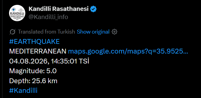 Kandilli Rasathanesi’nin paylaştığı verilere göre, Akdeniz’de bugün saat 14.35’te 5.0 büyüklüğünde deprem meydana geldi. Depremin yerin 25.6 kilometre derinliğinde gerçekleştiği bildirildi.