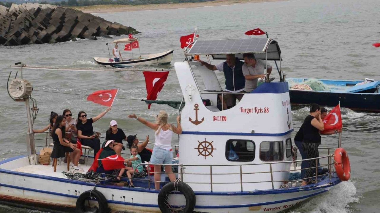 Karasu Kaymakamlığı önündeki Atatürk Anıtı’na çelenk sunumuyla başlayan törende ilçe protokolü, Karasu Yeni Mahallesi sahilinden teknelerle denize açıldı. Kaymakam Mehmet Uğur Arslan’ın da yer aldığı korteje; Sahil Güvenlik, polis botları, Karasu Liman Başkanlığı tekneleri, Sakarya Büyükşehir Belediyesi İtfaiye Daire Başkanlığı’na bağlı cankurtaranlar, balıkçılar ve vatandaşlar, Türk bayraklarıyla süslenmiş tekneleriyle eşlik etti. Sahil Park açıklarında Karasu İlçe Müftüsü Mehmet Çelebi’nin duasıyla birlikte, şehitler anısına denize çelenk bırakıldı. Etkinlik boyunca deniz üstünde adeta bayram havası yaşandı. Türk bayraklarıyla süslenen tekneler, sirenler eşliğinde korteji selamlarken, Karasu Liman İşletmesi’ne bağlı römorkörler gökyüzüne su sıkarak kutlamalara renk kattı.