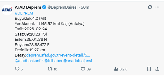Afet ve Acil Durum Yönetimi Başkanlığı'nın (AFAD) sosyal medya hesabı üzerinde yer alan bilgiye göre, merkez üssü Akdeniz olan 4.0 büyüklüğünde deprem gerçekleşti. Saat 09.28'de meydana gelen depremin yerin 19 kilometre derinliğinde kaydedildiği belirtildi.