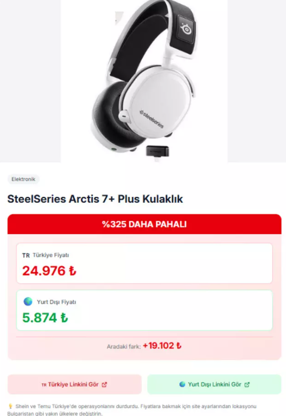 Örneğin, sitedeki bir kulaklık içeriğini ele alalım. Burada söz konusu kulaklığın Türkiye fiyatının 24.976 TL, yurt dışı fiyatının ise 5.874 TL olduğu bilgisine yer verilmiş. Buna ek olarak, kulaklığın Türkiye fiyatı ile yurt dışı fiyatı arasındaki farkın 19.102 TL olduğu gösterilerek "%325 daha pahalı" hesabı yapılmış.