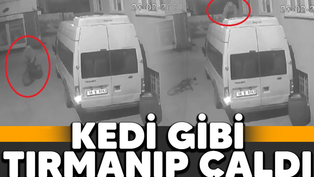 Olay, merkez Osmangazi ilçesinde meydana geldi. Ara sokaklarda bisikletiyle ilerleyen bir şüpheli, başını yukarı çevirdiğinde 3. katta balkona kuruması için asılan mont gördü. Bisikletten atlayan şüpheli, balkona erişmek için önce park halindeki servis aracının üzerine daha sonra da tırmanıp 3.kattaki balkona ulaştı. Servis aracından atlayan şüpheli bu kez de soluğu asfaltta aldı. Düşe kalka bisiklete binen kişi hızla olay yerinden kaçarken, görüntüleri izleyen vatandaş adeta şok yaşadı.