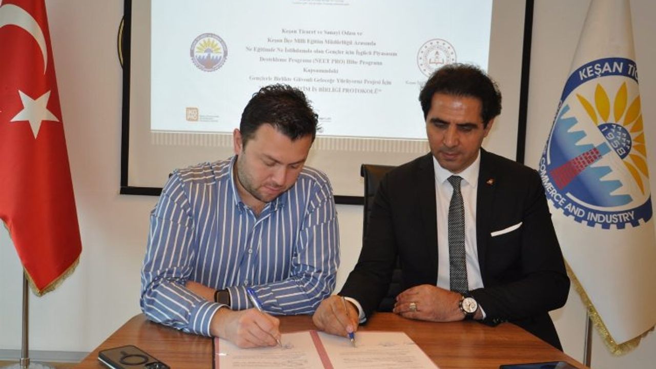 Keşan TSO (Ticaret ve Sanayi Odası) ile Keşan İlçe Milli Eğitim Müdürlüğü arasında dün ‘Ne Eğitimde Ne İstihdamda Olan Gençler İçin İş Gücü Piyasasını Destekleme Hibe Programı (NEET PRO)’ kapsamındaki Gençlerle Birlikte Güvenli Geleceğe Yürüyoruz Projesi için Mesleki Eğitim ve İş Birliği Protokolü imzalandı.Erdoğan DEMİR / EDİRNE (İGFA) - Keşan Ticaret ve Sanayi Odası Yönetim Kurulu Başkanı İsmail Şapçı ve Keşan İlçe Milli Eğitim Müdürü İlhan Saz’ın imzaladığı protokol toplantısına, Keşan TSO Genel Sekreter Yardımcısı Kadir Can Tunç, Halkla İlişkiler Sorumlusu Nur Kalıntaş ve AB Proje Koordinatörü Pelin Konar da katılım sağladı.