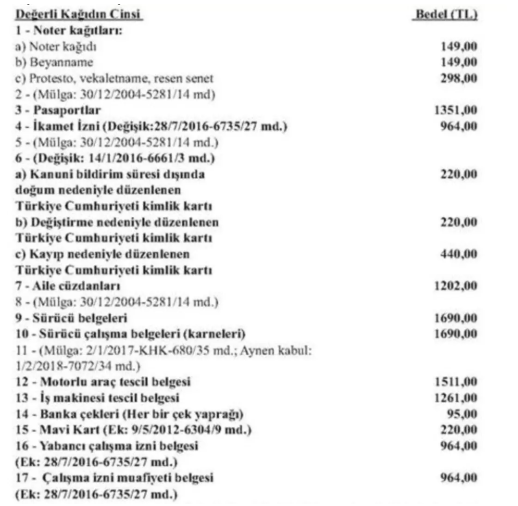 Tebliğ kapsamında pasaport, sürücü belgesi, Türkiye Cumhuriyeti kimlik kartı, noter kağıtları ve araç tescil belgeleri gibi "değerli kağıtlar" olarak nitelendirilen birçok resmi evrak için alınacak ücretler güncellendi.