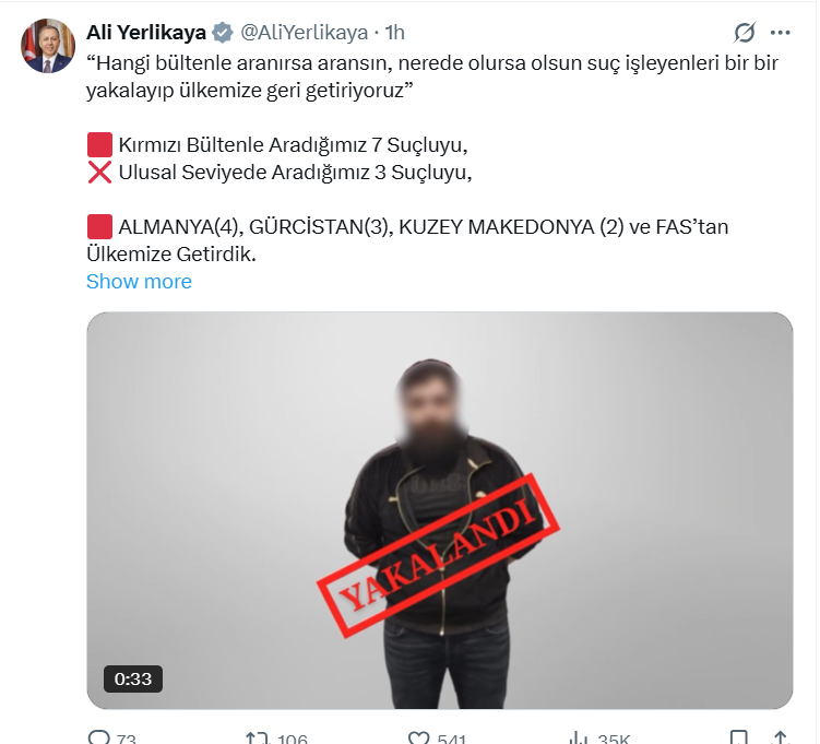 Paylaşımda, Almanya, Gürcistan, Kuzey Makedonya ve Fas’tan toplam 10 kişinin Türkiye’ye getirildiği belirtildi. Kırmızı bültenle uluslararası seviyede aranan 7 kişi ile ulusal seviyede aranan 3 kişi, Emniyet Genel Müdürlüğü Interpol-Europol Daire Başkanlığı, Adalet Bakanlığı ve ilgili birimlerin koordineli çalışması sonucu yakalanarak ülkeye iade edildi.