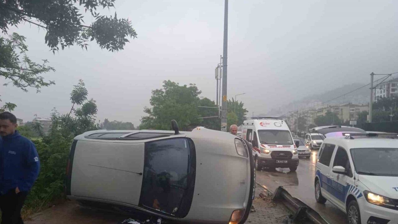 Bursa’da sürücünün kontrolünden çıkan otomobil yan yattı. Sürücü otomobilden çevredeki vatandaşlar tarafından çıkarıldı.