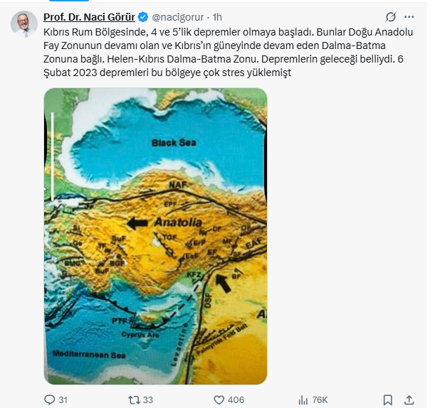 Konuyla ilgili açıklama yapan Prof. Dr. Görür, sarsıntıların Kıbrıs’ın güneyinde yer alan Dalma-Batma Zonu ile ilişkili olduğunu belirtti. Görür, "Kıbrıs Rum Bölgesinde, 4 ve 5’lik depremler olmaya başladı. Bunlar Doğu Anadolu Fay Zonunun devamı olan ve Kıbrıs’ın güneyinde devam eden Dalma-Batma Zonuna bağlı. Helen-Kıbrıs Dalma-Batma Zonu. Depremlerin geleceği belliydi. 6 Şubat 2023 depremleri bu bölgeye çok stres yüklemişti" ifadelerini kullandı.
