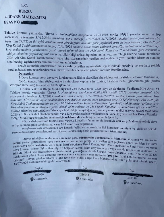 Yargılama süreci kapsamında Bursa Vakıflar Bölge Müdürlüğü'nden, taşınmaza ilişkin mülkiyet belgeleri, kira sözleşmesi ve "fuzuli şagil" tespitine dair tüm evrakların gönderilmesi istendi. İdareye savunma için 10 günlük süre tanındı.