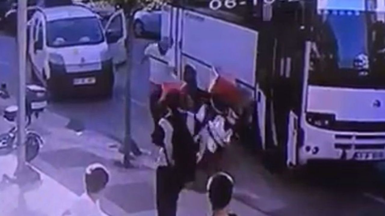 Görüntülerde, seyir halindeki bir servis minibüsünün aniden durarak motosikletli kuryenin yolunu kestiği görülüyor. Minibüsten öfkeyle inen sürücünün, doğrudan kuryenin üzerine yürüyerek tartışmaya başladığı, darbettiği, bıçak çektiği ve gencin motosikletiyle birlikte yere devrildiği anlar da görüntüde yer alıyor.