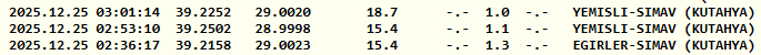 Kandilli'nin resmi internet sitesi üzerindeki verilere göre ilk deprem saat 02.36'da 1.3 büyüklüğünde gerçekleşti. İkinci deprem 02.53'te 1.1 büyüklüğünde gerçekleşirken son deprem ise 03.01'de 1.0 büyüklüğünde meydana geldi. Kandilli, Simav merkezli depremlerin derinliklerini sırasıyla 15.4, 15,4, 18.7 kilometre olarak açıkladı.