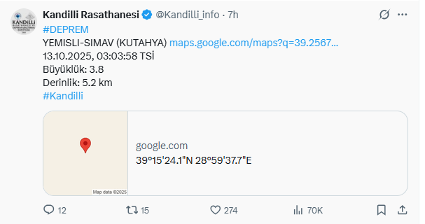 Kandilli Rasathanesi sosyal medya hesabı üzerinden yaptığı paylaşımda Kütahya'da deprem meydana geldiğini duyurdu. Paylaşımda depremin saat 03.03'te 3.8 büyüklüğünde gerçekleştiği belirtildi. Simav merkezli depremin derinliği 5.2 olarak ölçüldü.