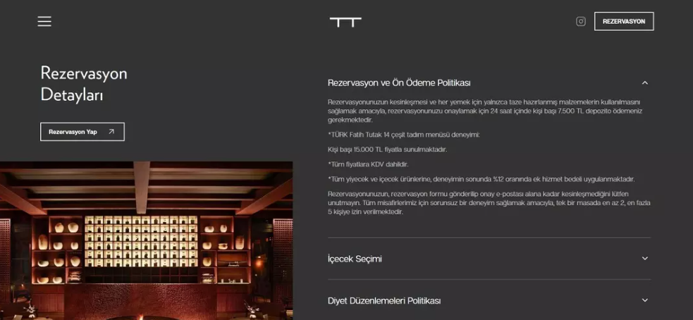 Şef Fatih Tutak’ın imzasını taşıyan restoran, modern Türk mutfağını uluslararası tekniklerle buluşturmasıyla biliniyor. TURK Fatih Tutak, 2023 ve 2024 Michelin Rehberi’nde iki yıldızını koruyarak Türkiye gastronomisinin en prestijli adreslerinden biri olmayı sürdürmüştü.