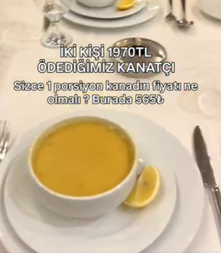 İstanbul Kartal'da bir restoranda yediği tavuk kanadın faturasıyla ilgili yapılan paylaşım gündem oldu. Paylaşımda belirtilene göre içerik üreticisi, tavuk kanada 1.130 TL, toplam hesap tutarına ise 1.970 TL ödediğini dile getirdi. Siparişte yalnızca 2 porsiyon çorba, 2 porsiyon kanat ve 1 porsiyon salatanın yer aldığı görüldü.