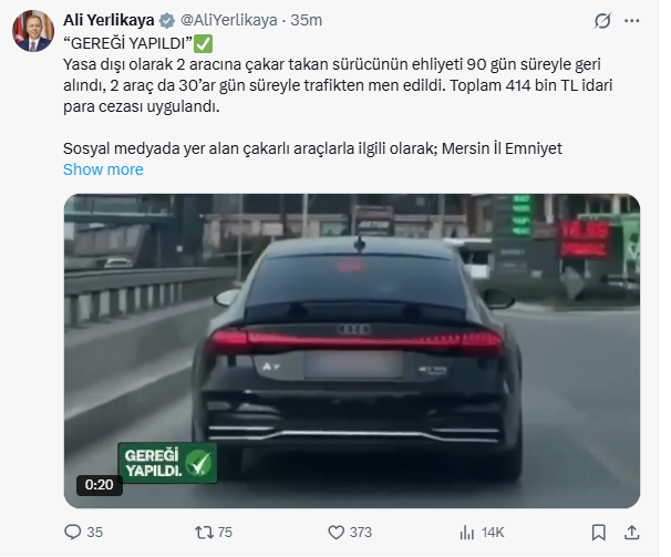 Sosyal medyada yer alan çakarlı araç görüntülerinin ardından, Mersin İl Emniyet Müdürlüğü Trafik Denetleme Şube Müdürlüğü ekiplerince yapılan çalışmalar sonucunda, çakarlı iki aracın sahibinin H.A. isimli şahıs olduğu belirlendi. Şahıs hakkında, 2918 sayılı Karayolları Trafik Kanunu kapsamında, izin verilmeyen araçlara ışıklı ve/veya sesli uyarı işareti veren cihazları takmak ve kullanmak suçundan cezai işlem yapıldı.