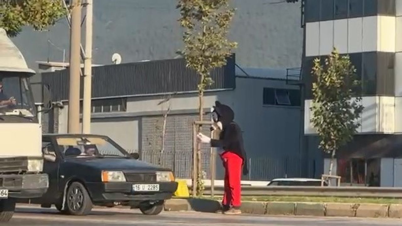 Bursa'nın Kestel ilçesinde, şehirlerarası yolda Miki Fare kostümü ile peçete satan kişi, sürücülerin ilgi odağı oldu. Kostüm ile sürücülere selam verip peçete satmak için araçlara yaklaşan kişi, herkesin yüzünü güldürdü. Bazı sürücüler hayret dolu gözlerle ne olup bittiğini anlamaya çalışırken, kimileri ise hoşuna gittiği için korna çalarak selam verdi.