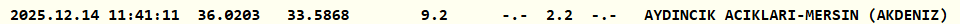 Kandilli Rasathanesi verilerine göre, saat 11.41’de Akdeniz’de Mersin’in Aydıncık açıklarında 2.2 büyüklüğünde deprem meydana geldi. Depremin yerin 9.2 kilometre derinliğinde gerçekleştiğini belirtildi.