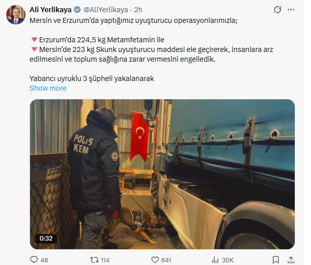 Bakan Yerlikaya, Erzurum’da 224,5 kilogram metamfetamin, Mersin’de ise 223 kilogram skunk uyuşturucu maddesinin ele geçirildiğini belirtti. Operasyonlarda yabancı uyruklu 3 şüpheli yakalanarak gözaltına alındı.