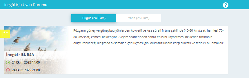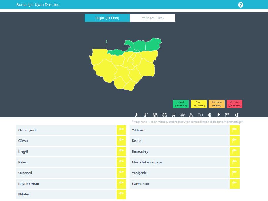 Yayımlanan listede, Osmangazi, Gürsu, İnegöl, Keles, Orhaneli, Büyükorhan, Nilüfer, Yıldırım, Kestel, Karacabey, Mustafakemalpaşa, Yenişehir ve Harmancık ilçeleri sarı uyarı kapsamına alınırken, Mudanya, Gemlik, İznik ve Orhangazi’nin ise fırtına uyarısı dışında tutuldu.
