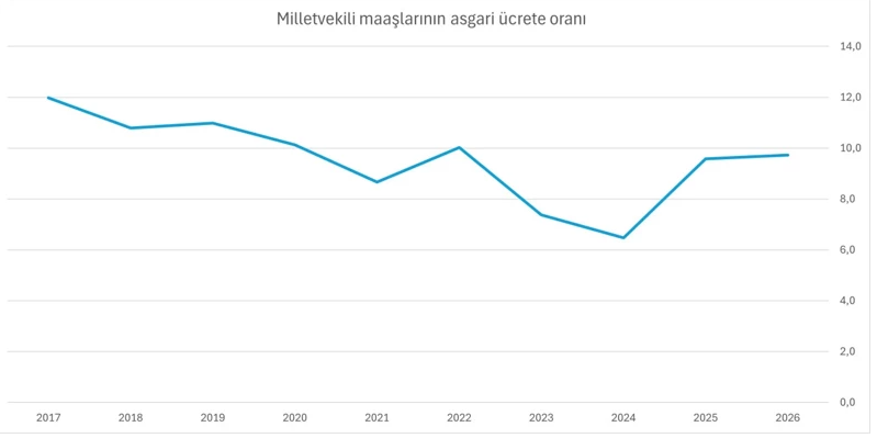 2026 yılı için asgari ücret, yüzde 27’lik artışla 28 bin 75 TL olarak açıklanırken, milletvekili maaşı asgari ücretin 9,7 katına ulaştı. Bu oran 2017’de 12 seviyesindeyken, 2021’de 8,8’e, 2024’te ise 6,5’e kadar düştü. Yıllar içindeki dalgalanma dikkat çekici bir tablo ortaya koydu.