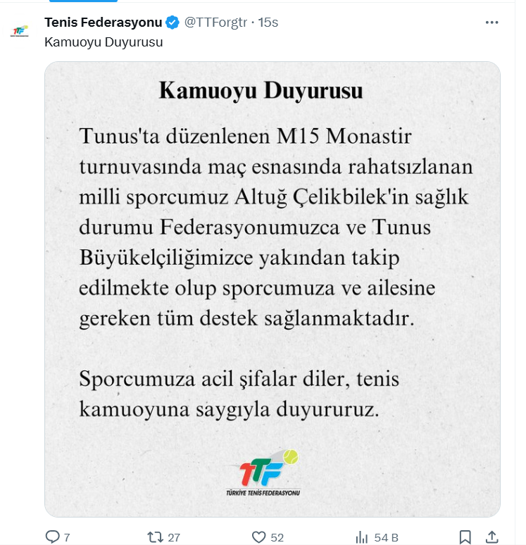 "Tunus'ta düzenlenen M15 Monastir turnuvasında maç esnasında rahatsızlanan milli sporcumuz Altuğ Çelikbilek'in sağlık durumu Federasyonumuzca ve Tunus Büyükelçiliğimizce yakından takip edilmekte olup sporcumuza ve ailesine gereken tüm destek sağlanmaktadır. Sporcumuza acil şifalar diler, tenis kamuoyuna saygıyla duyururuz."