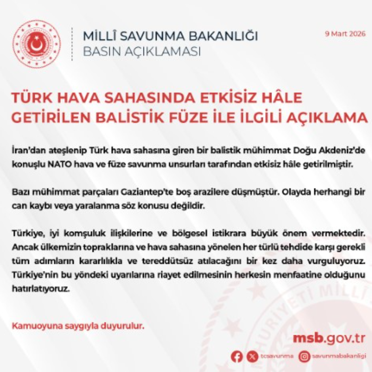 "İran’dan ateşlenip Türk hava sahasına giren bir balistik mühimmat Doğu Akdeniz’de konuşlu NATO hava ve füze savunma unsurları tarafından etkisiz hale getirilmiştir. Bazı mühimmat parçaları Gaziantep’te boş arazilere düşmüştür. Olayda herhangi bir can kaybı veya yaralanma söz konusu değildir. Türkiye, iyi komşuluk ilişkilerine ve bölgesel istikrara büyük önem vermektedir. Ancak ülkemizin topraklarına ve hava sahasına yönelen her türlü tehdide karşı gerekli tüm adımların kararlılıkla ve tereddütsüz atılacağını bir kez daha vurguluyoruz. Türkiye’nin bu yöndeki uyarılarına riayet edilmesinin herkesin menfaatine olduğunu hatırlatıyoruz."