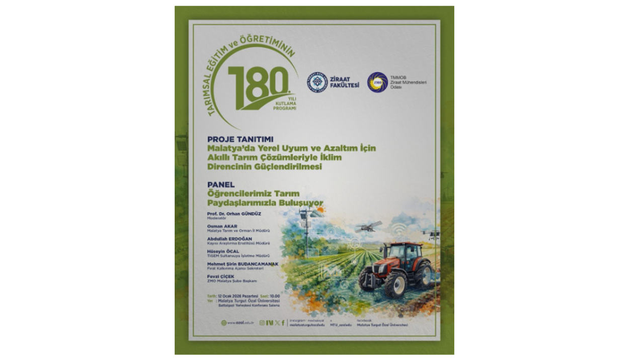 MTÜ Ziraat Fakültesi tarafından hazırlanan "Tarımsal Eğitim ve Öğretiminin 180. Yılı Kutlama Programı" kapsamında öğrenciler, Malatya’daki tarım paydaşlarıyla bir araya gelecek. Programda, Malatya’da Yerel Uyum ve Azaltım İçin Akıllı Tarım Çözümleriyle İklim Direncinin Güçlendirilmesi projesinin tanıtımı yapılacak. Tanıtımın ardından, öğrenciler ile tarım paydaşlarını buluşturan bir panel gerçekleştirilecek.