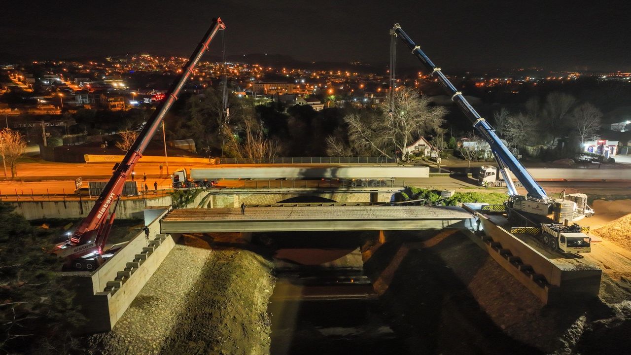 Bursa’nın ulaşım sorununu bilimsel veriler ışığında çözmek için çalışmalarını sürdüren Büyükşehir Belediyesi, Mudanya Yolu üzerindeki dar boğazı ortadan kaldıracak Geçit Köprüsü Projesi’ni aralıksız sürdürüyor. Nilüfer Çayı üzerinde 42 metre uzunluğunda ve 25 metre genişliğinde yapılması planlanan Geçit Köprüsü’nde, şu ana kadar 58 adet fore kazık imalatı tamamlandı. Çalışmaların 5 gece sürmesi planlanırken, Ulaşım Dairesi Başkanlığı ekipleri yoğun mesai harcayarak işlemleri eksiksiz yürütüyor. 00.00-06.00 saatleri arasında Mudanya-şehir merkezi istikameti trafiğe kapatılırken, köprünün en önemli aşamalarından olan 20 adet öngerme kirişinin montajı ekipler tarafından büyük bir titizlikle gerçekleştiriliyor. Çalışmalar sırasında sürücüler alternatif güzergâhlara yönlendirilerek ulaşımın kontrollü şekilde devam etmesi sağlanıyor.