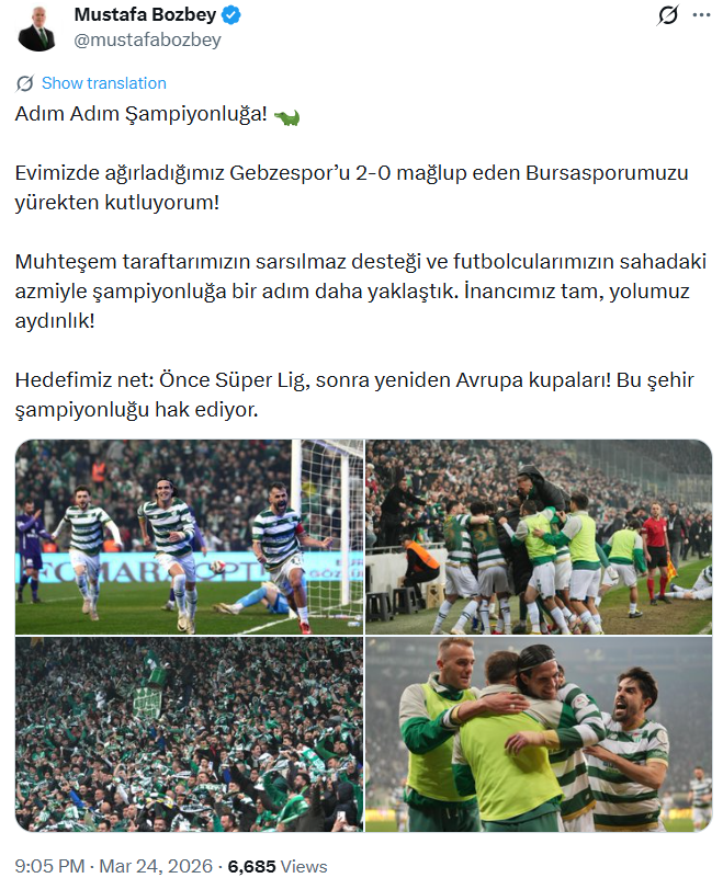 Karşılaşmanın ardından Başkan Mustafa Bozbey, sosyal medya hesabı üzerinden yaptığı paylaşımda yeşil-beyazlı ekibi tebrik etti. Bozbey, Bursaspor’un ortaya koyduğu mücadele ve taraftarın güçlü desteğine dikkat çekerek, takımın şampiyonluğa bir adım daha yaklaştığını ifade etti.