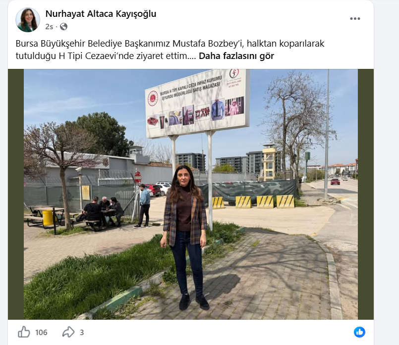 CHP Bursa Milletvekili Nurhayat Altaca Atmaca, resmi sosyal medya sayfalarından yaptığı bilgilendirmede, “ Bursa Büyükşehir Belediye Başkanımız Mustafa Bozbey’i, halktan koparılarak tutulduğu H Tipi Cezaevi’nde ziyaret ettim. Başkanımızın morali yüksek, sağlığı yerinde; tüm hemşehrilerimize içten selamlarını iletiyor.” dedi.