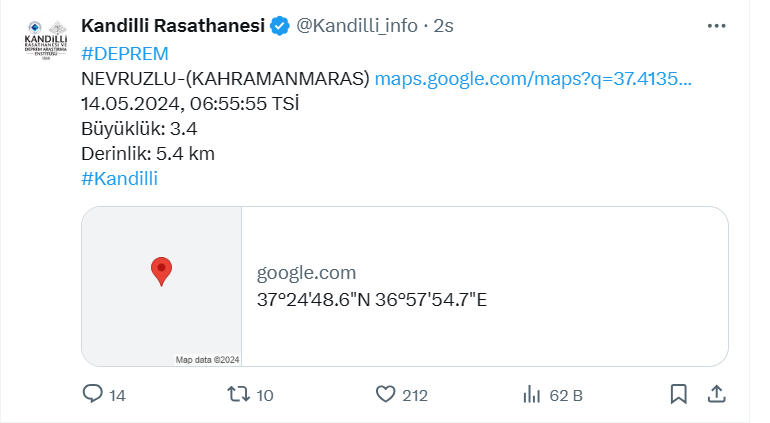 Kandilli Rasathanesi sosyal medya hesabı üzerinden yaptığı paylaşımda Kahramanmaraş Nevruzlu'da deprem meydana geldiğini açıkladı.