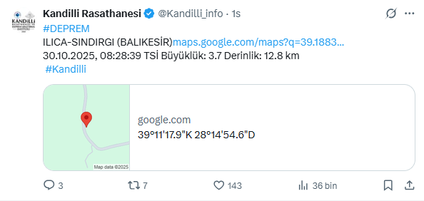 Kandilli'nin sosyal medya hesabı üzerinden yapılan paylaşıma göre deprem saat 08.28'de 3.7 büyüklüğünde gerçekleşti. Merkezi Sındırgı olan deprem yerin 12.8 kilometre derinlikte meydana geldi.