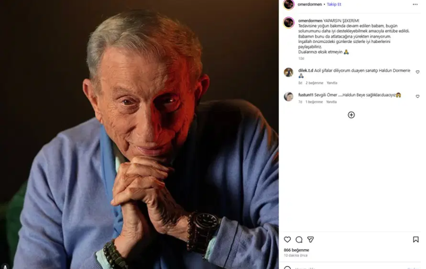 97 yaşındaki usta sanatçının entübe edildiği açıklandı. Açıklamayı oğlu Ömer Dormen sosyal medya hesabı üzerinden yaptı.