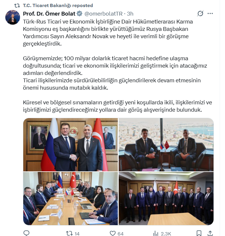 Bolat, küresel ve bölgesel gelişmelerin şekillendirdiği yeni dönemde, Türkiye ile Rusya arasındaki ikili ilişkilerin ve ekonomik iş birliğinin daha da ileri taşınmasına yönelik görüş alışverişinde bulunulduğunu aktardı.