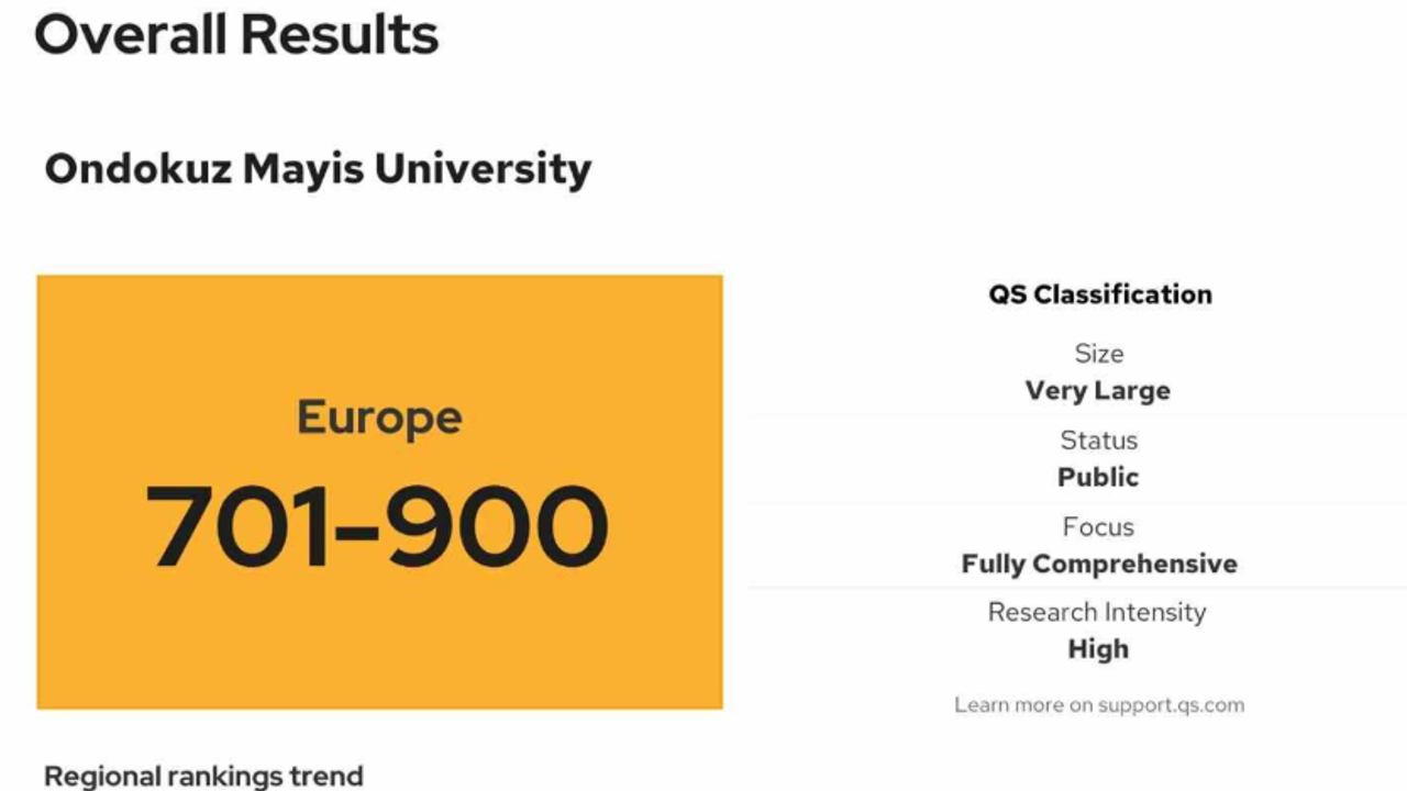 QS’in Avrupa genelinde gerçekleştirdiği değerlendirmede OMÜ, Avrupa Üniversiteleri Sıralaması’nda 701–900 bandında yer aldı. Üniversite, Batı Asya Bölgesi sıralamasında ise 79’uncu sırada konumlandı. Elde edilen sonuçlar, OMÜ’nün uluslararası görünürlüğünü istikrarlı bir şekilde artırdığını ortaya koydu.
